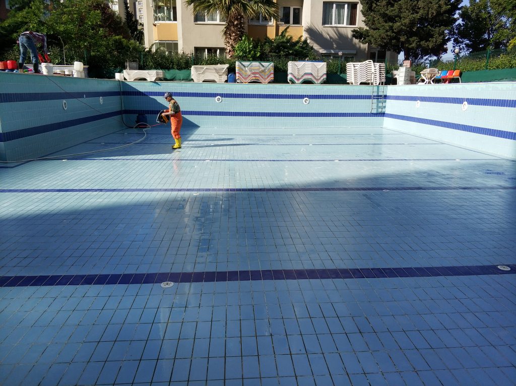 Boşaltılan havuzun taban ve duvarlarındaki kireç, yosun ve diğer kir kalıntılarının özel kimyasallar kullanılarak temizlenmesi ve dezenfeksiyonu.